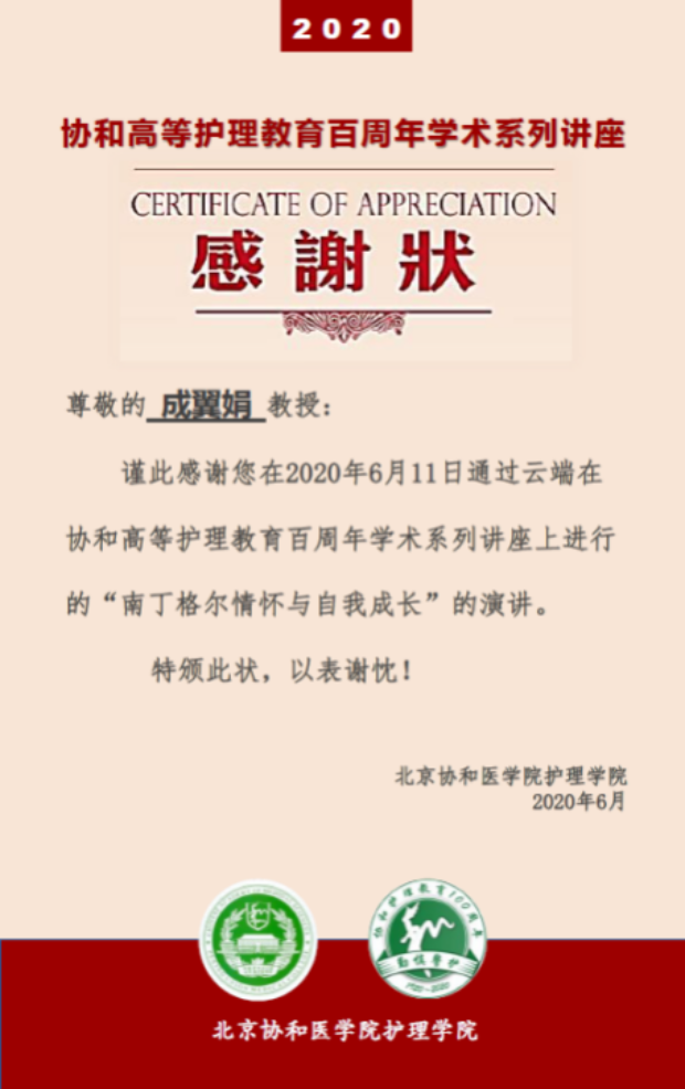2020年beat365中国唯一官网迎来了协和高等护理教育百周年,为庆祝和纪念这一重要历史时刻,6月11日下午,临床护理学系邀请到四川大学华西医院原护理部主任、第44届南丁格尔奖章获得者成翼娟教授、以及四川大学华西医院护理部主任、协和护理优秀毕业生蒋艳教授为beat365中国唯一官网广大师生进行讲座。