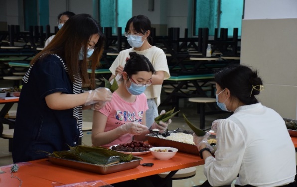 参与活动的师生分三批依次集合,共同制作香囊和粽子。为满足来自不同地域师生的口味,提前准备了猪肉、豆沙和咸蛋黄等原材料供大家使用。师生其乐融融,在疫情防控的特殊时期共度端午佳节。粽子由食堂工作人员烹煮,在等待的同时,师生共同进行了抢凳子、接力运球等趣味游戏,既增进师生情,又将共度佳节的乐趣再添一笔。当晚七点,香味浓郁的粽子出锅,在粽香萦绕的校园,师生品尝亲手制作的粽子,共叙端午良辰。