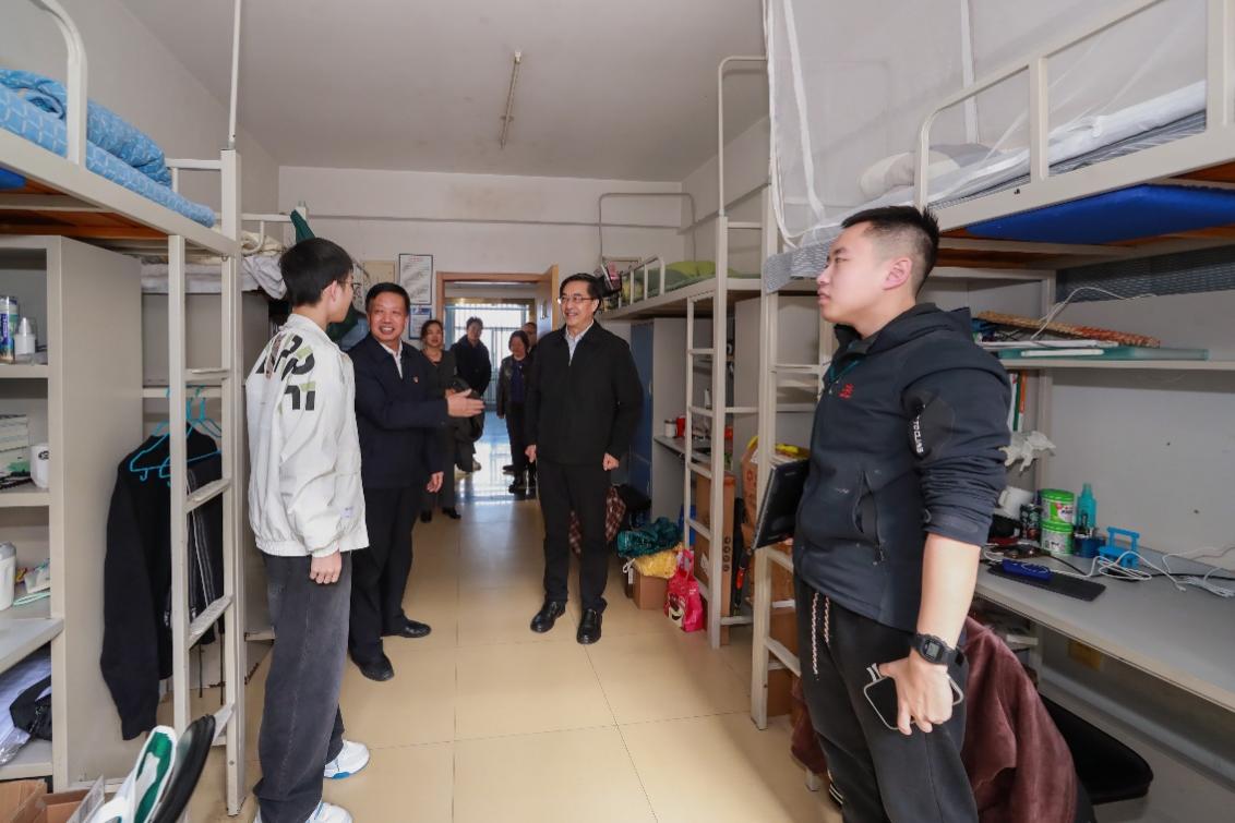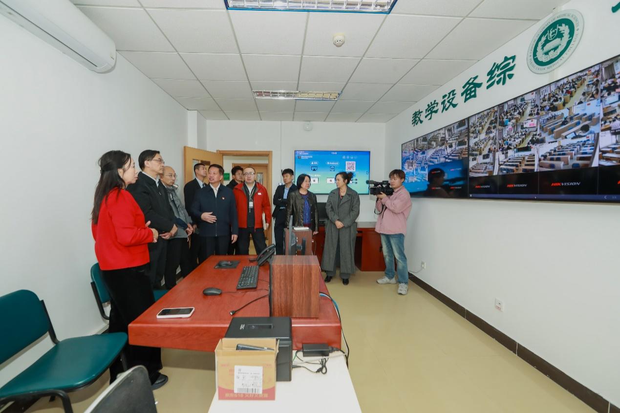 邓海华书记一行深入校园,首先来到学生宿舍看望慰问学生,并与学生亲切交谈,了解学生学习、生活情况,实地察看学生食堂、体育活动中心、毓禅报告厅、院史馆、图书室、实验教学中心和多媒体教室控制中心等处,不时与现场老师交流,了解学院教育教学、学生管理、安全生产、教学技术和后勤保障等工作,叮嘱学院要全方位保障好学生的学习生活,为学生打造安全舒适的学习环境。