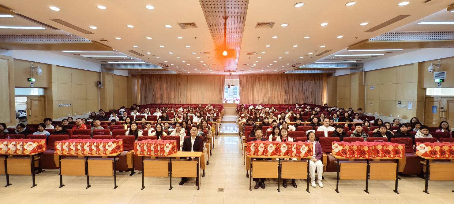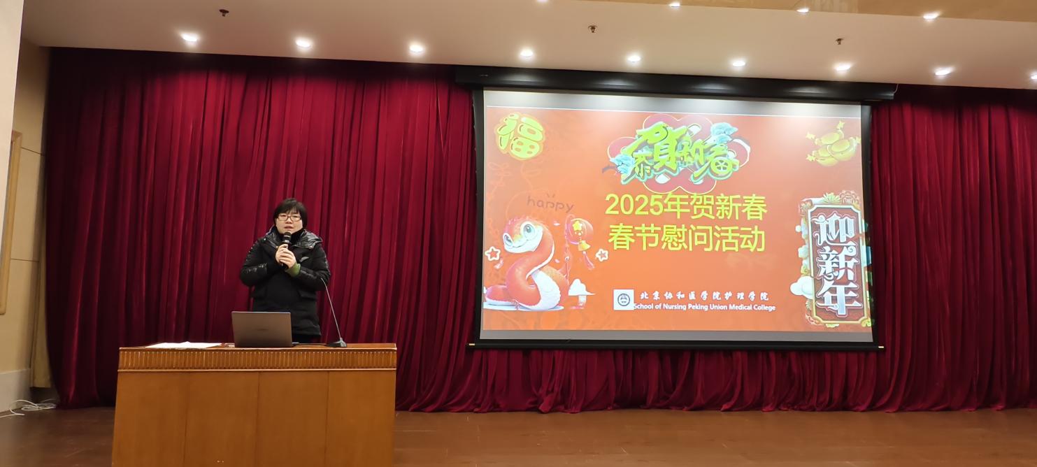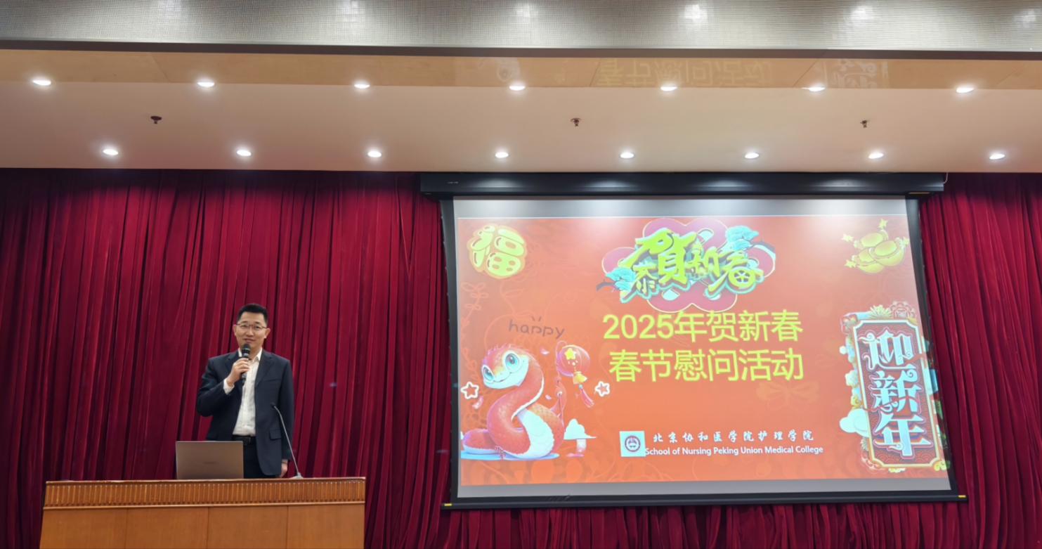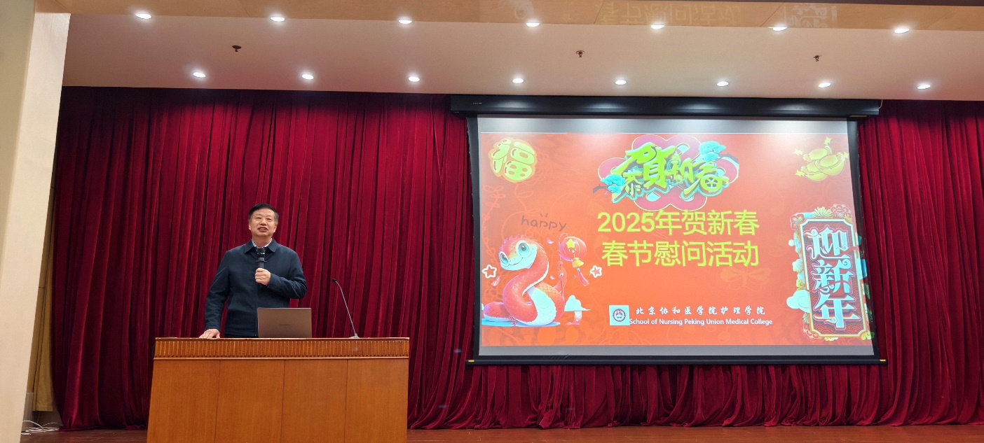 旧岁已展千重锦,新年更进百尺竿。学院党委书记安道彩带领大家回首甲辰龙年,学院以“立德树人”为己任,砥砺奋进、开拓创新,取得丰硕成果。展望未来,乙巳蛇年适逢协和高等护理教育105周年暨恢复高等护理教育40周年,希望同学们在最后的大学生活中,仍然保持初心、追寻梦想、勤奋学习、努力工作、练就专业本领,创造属于自己的辉煌,为自己精彩人生不懈奋斗。在喜庆祥和的气氛中,崔庚申处长和安道彩书记向同学们送上慰问品,祝愿同学们在学校度过一个快乐、平安、幸福、祥和的新春佳节。