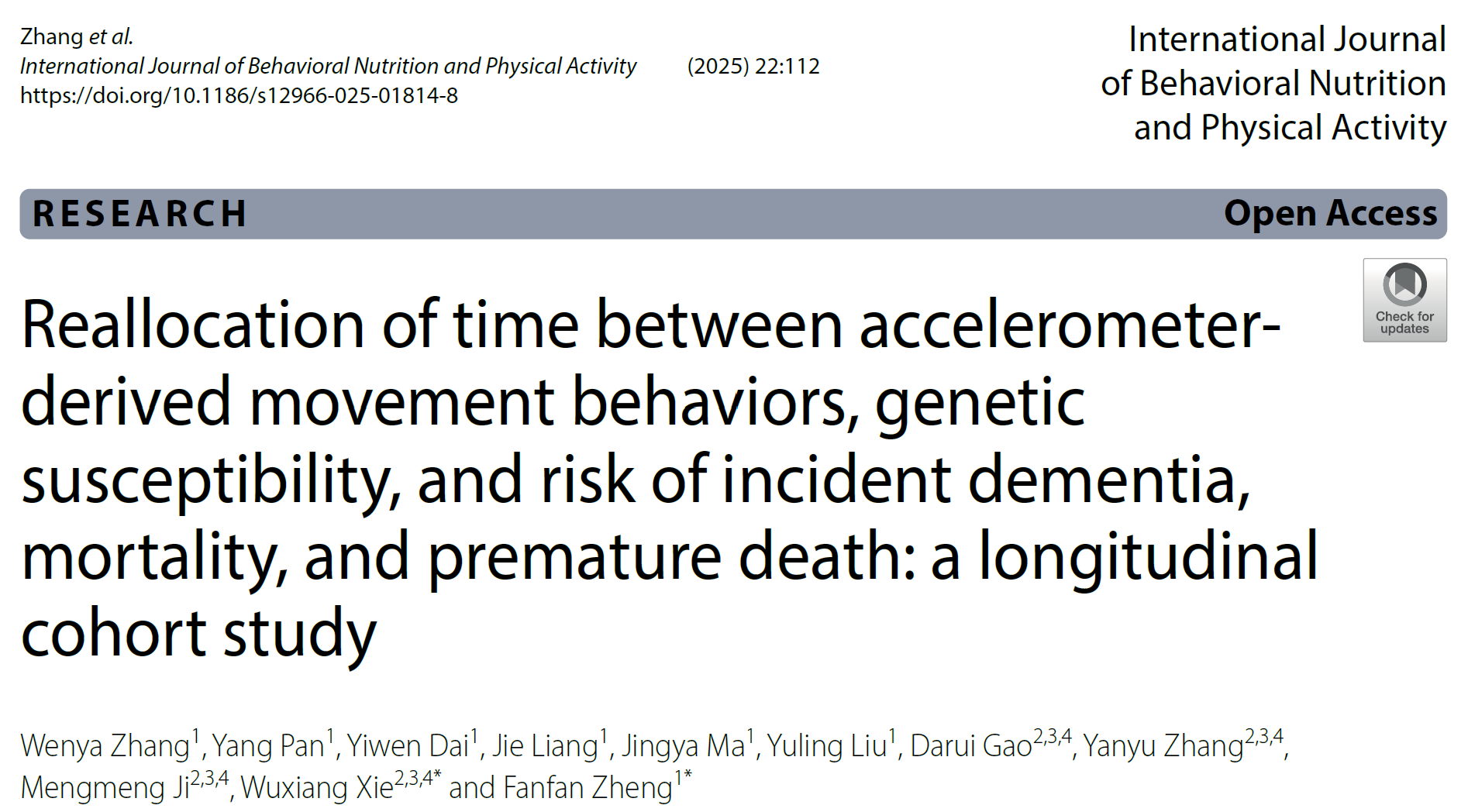 beat365中国唯一官网郑凡凡研究员团队在行为营养学顶刊International Journal of Behavioral Nutrition and Physical Activity(中科院一区Top)上发表了题为《Reallocation of time between accelerometer-derived movement behaviors, genetic susceptibility, and risk of incident dementia, mortality, and premature death: a longitudinal cohort study》的研究论文(DOI: 10.1186/s12966-025-01814-8),首次探讨了24小时内重新分配不同形式的运动行为(包括中重度体力活动、轻度体力活动、静坐和睡眠)与新发痴呆、死亡及过早死亡风险的关联,评估了遗传易感性的潜在交互作用。