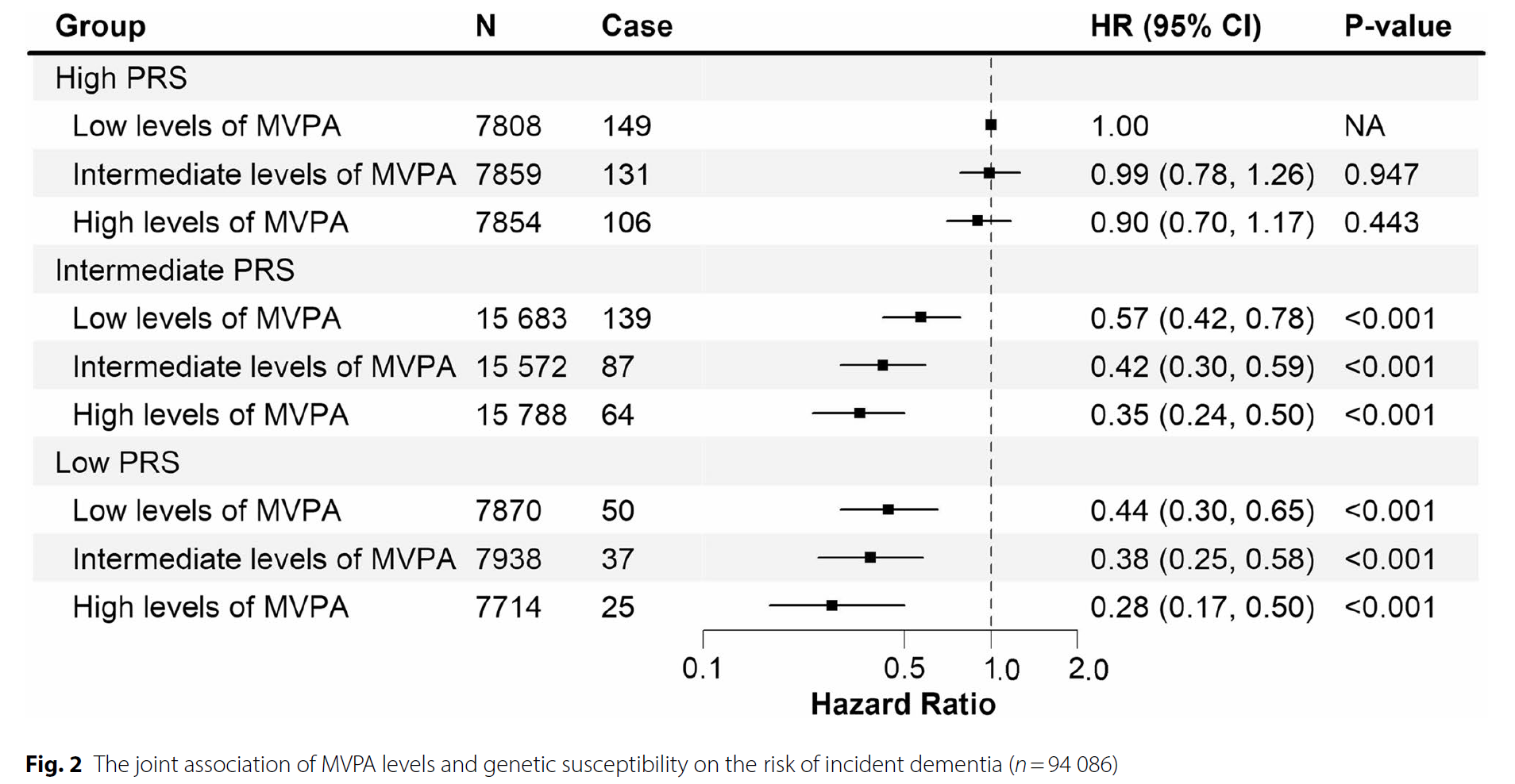 此外,本研究还根据痴呆的多基因风险评分(PRS),将人群的遗传易感性分为低、中、高三类。结果显示,相比于PRS高但运动水平低的人群,PRS低且运动水平高的人群患痴呆风险下降72%。PRS中等且运动水平高的人群,其患痴呆的风险与PRS低且中等运动水平的人群相当,提示增强运动有助于“弥补”一部分基因劣势。