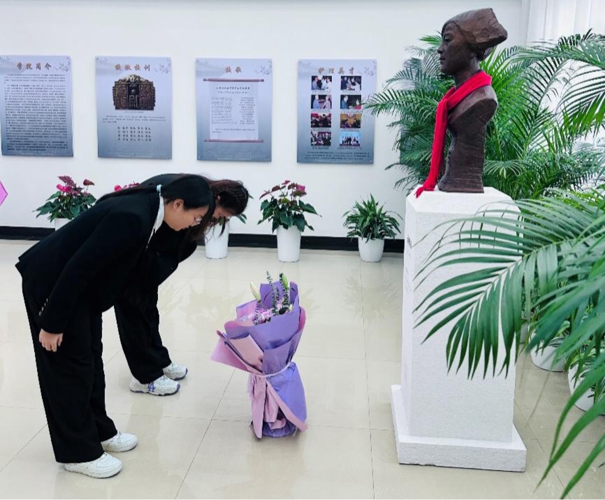 在悠扬的旋律中,院长李峥教授和学生代表一起为聂校长雕像敬系围巾、礼献花篮,深切表达学院师生对校长的崇高敬意和无限感激。