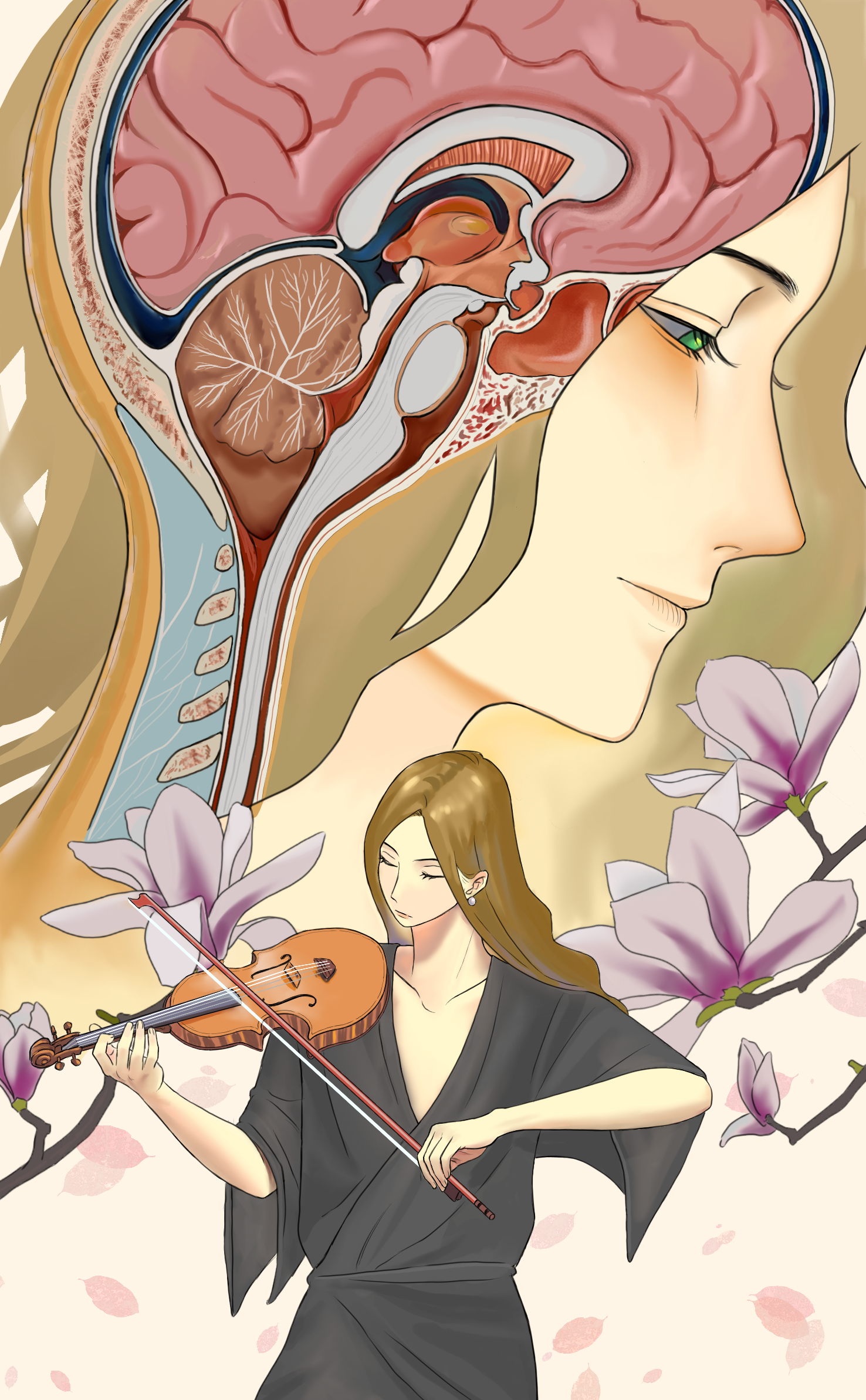 《奏》描绘的主题是小提琴手Dagmar Turner演奏的场景,以及她的颅脑矢状面解剖图。这是2020年,为防止手术对手部精细运动神经造成破坏而在术中进行的演奏,一场以现代医学技术为依托而成就的不可思议的音乐盛宴。演奏为手术点缀浪漫,手术为演奏延续精彩——正如画中盛放的玉兰一般,象征着美丽、生命与奇迹。简怡茗同学创作这幅作品,旨在向大家分享她眼中医学与艺术的碰撞,外科手术与医学伦理学的高光时刻。